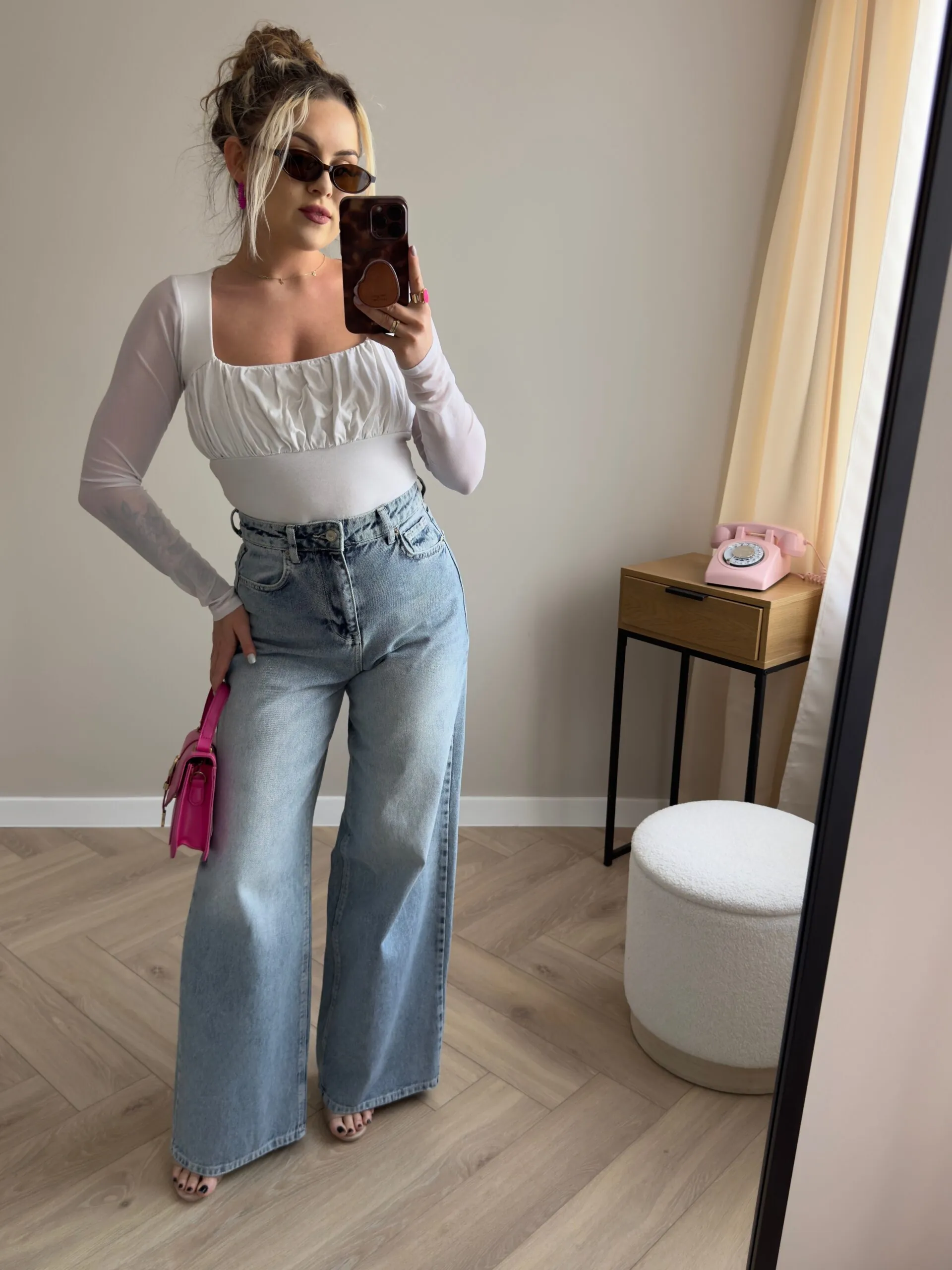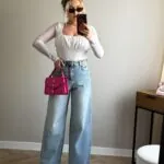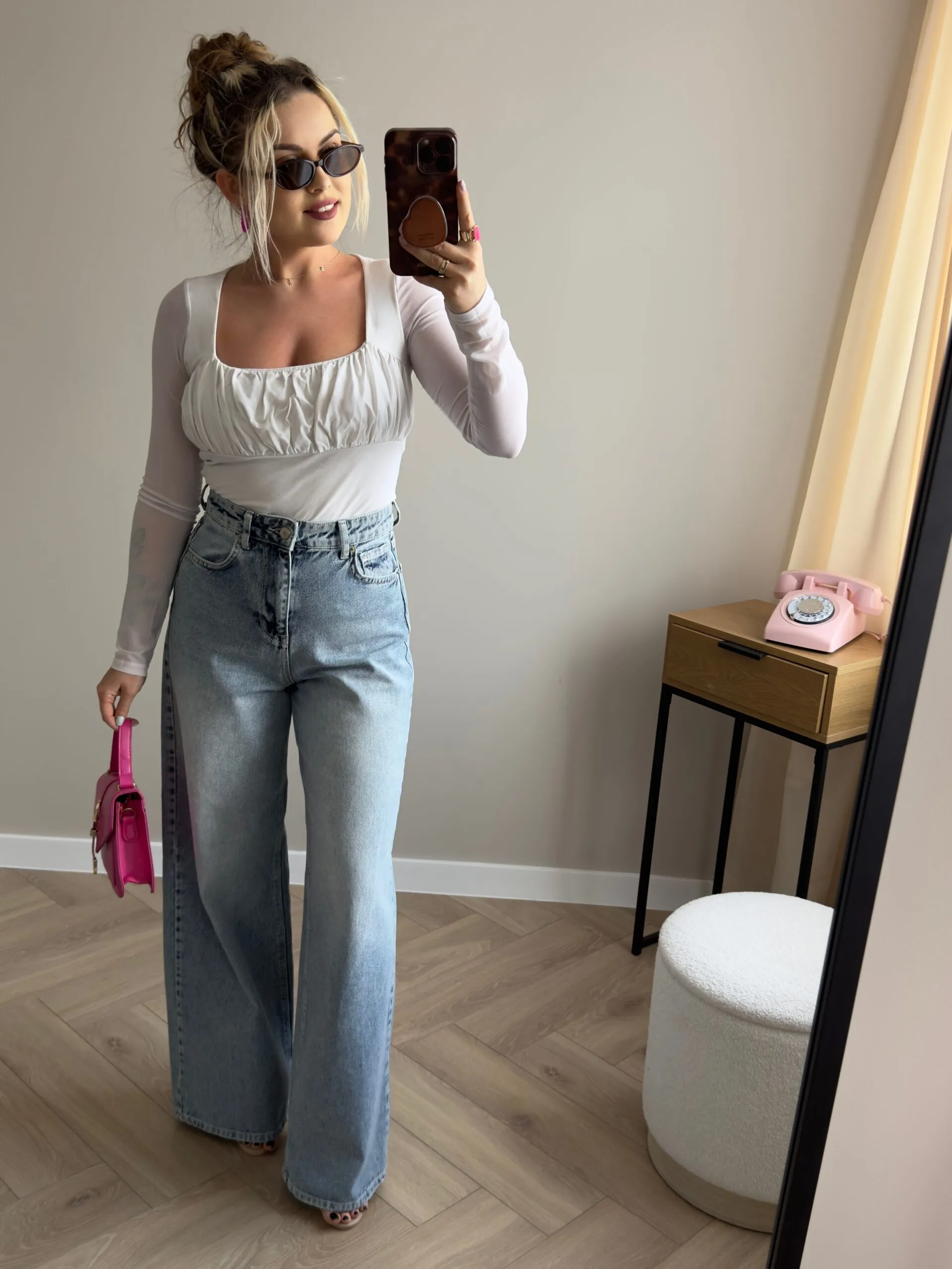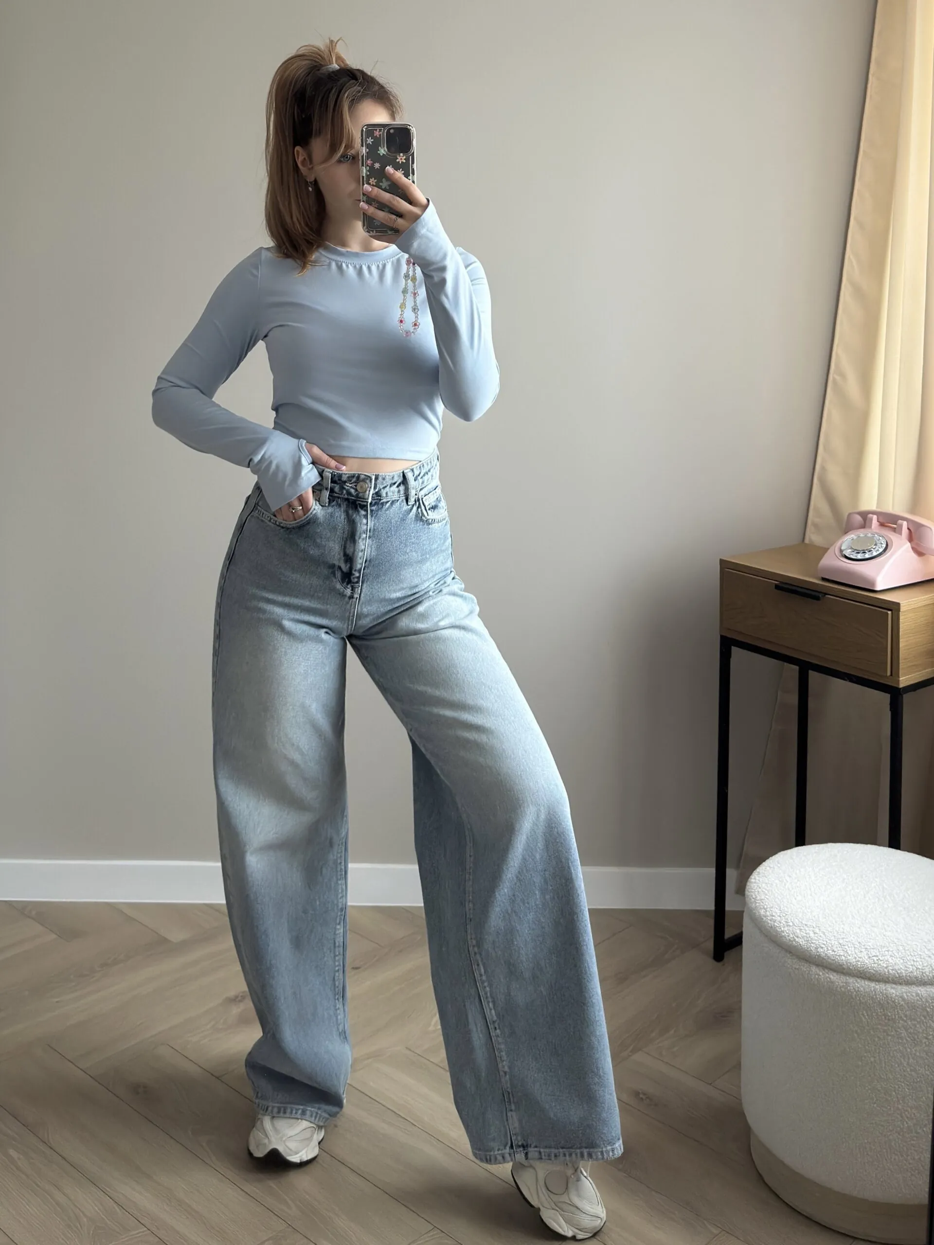Jeansy damskie o szerokiej nogawce w modnym kroju wide leg, które podkreślają talię, optycznie wydłużają sylwetkę. Wysoki stan zapewnia idealne dopasowanie i komfort noszenia, a klasyczny odcień denimu sprawia, że model pasuje do wielu stylizacji.