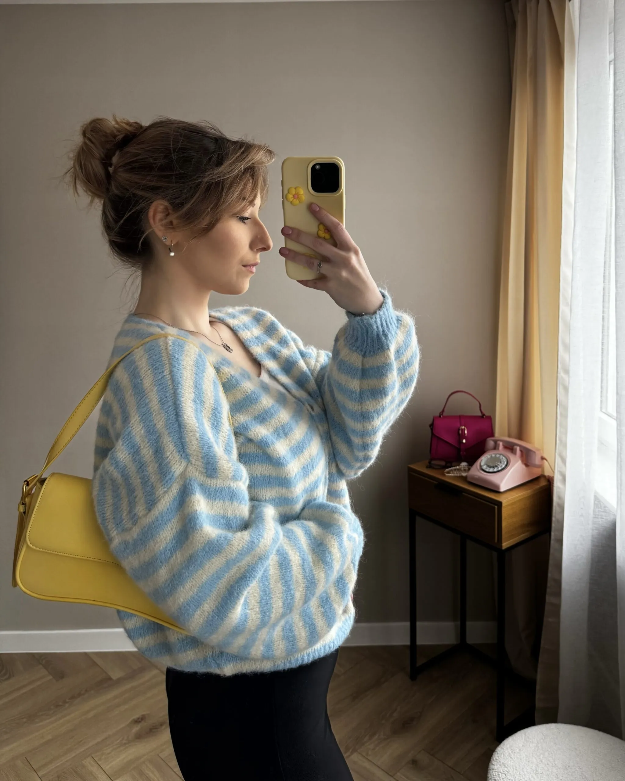 Wyjątkowo miękki i kobiecy model, który przyciąga uwagę pastelowym połączeniem. Delikatna, puszysta dzianina otula sylwetkę, a luźniejszy fason zapewnia komfort noszenia i swobodę. Subtelne paski nadają mu lekkości i świeżości, idealnej na wiosenne stylizacje.
