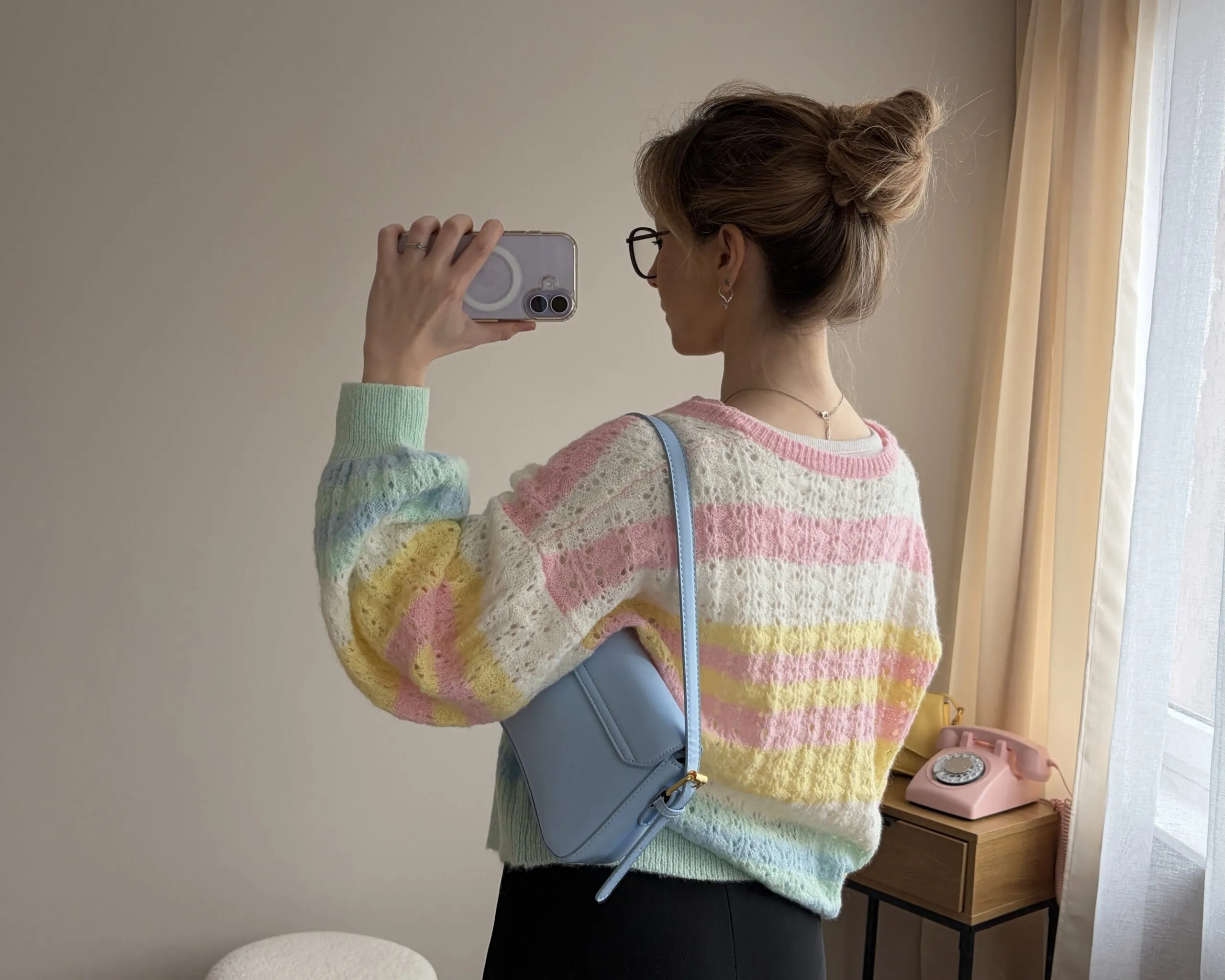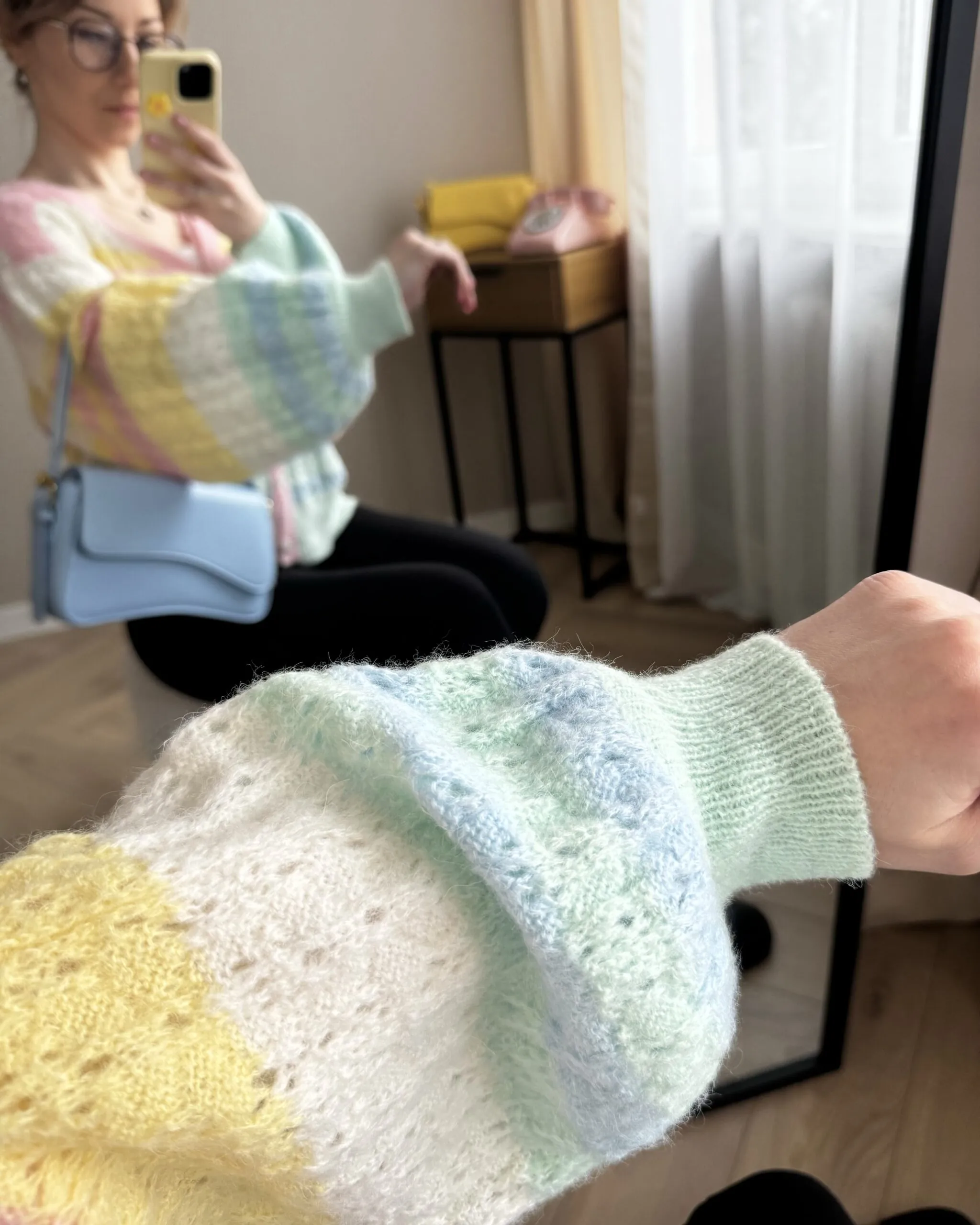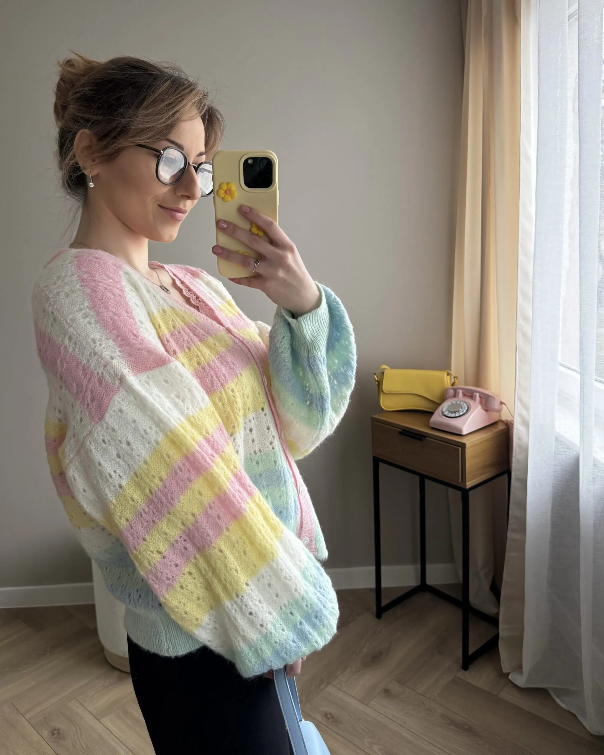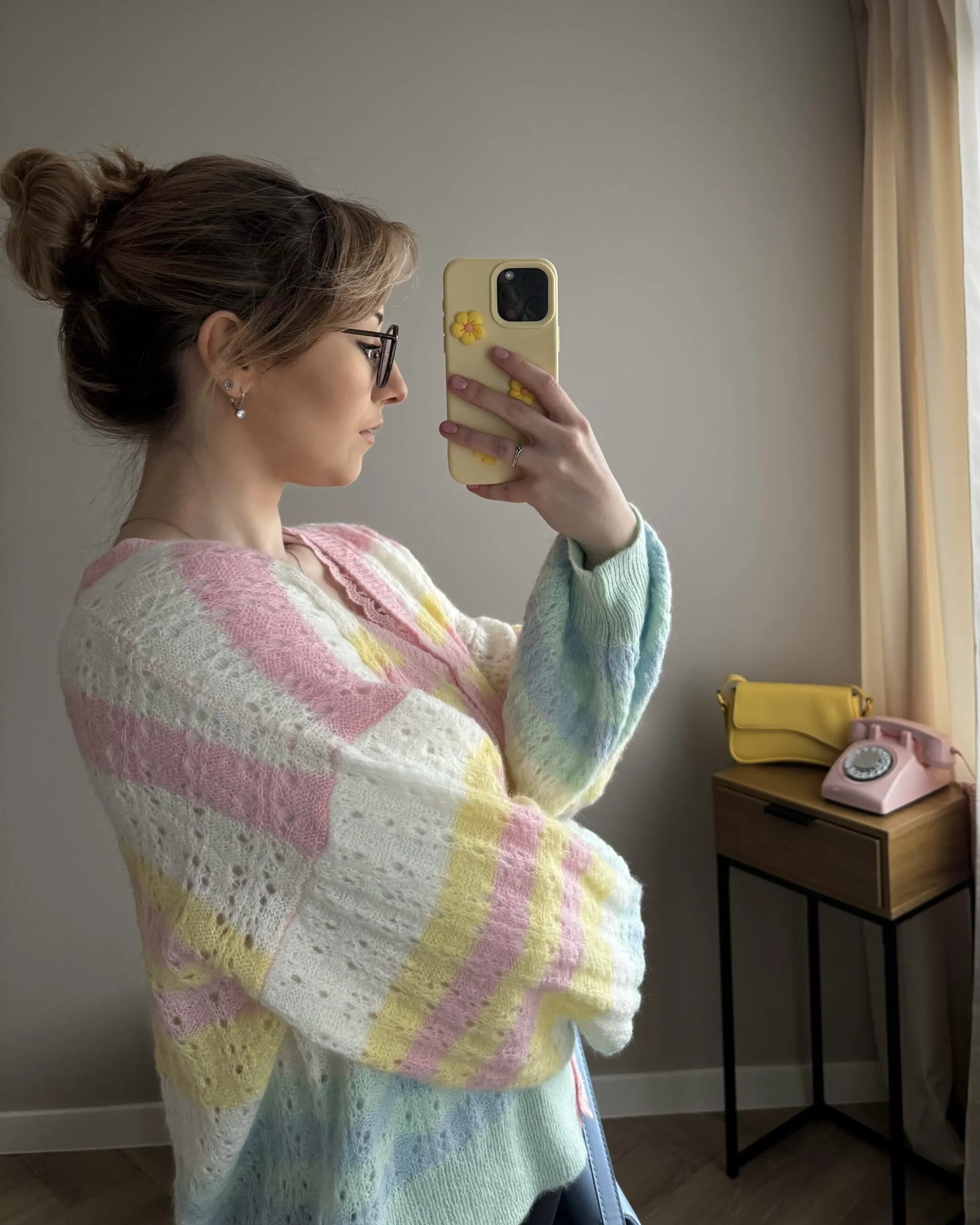 Model w pastelowej, wielokolorowej odsłonie, który przyciąga spojrzenia i nadaje stylizacji lekkości. Delikatna, ażurowa dzianina sprawia, że jest niezwykle lekki i idealny na wiosnę. Subtelne przejścia kolorów tworzą efekt ,,soft rainbow”, który pięknie zdobi całą stylizację.