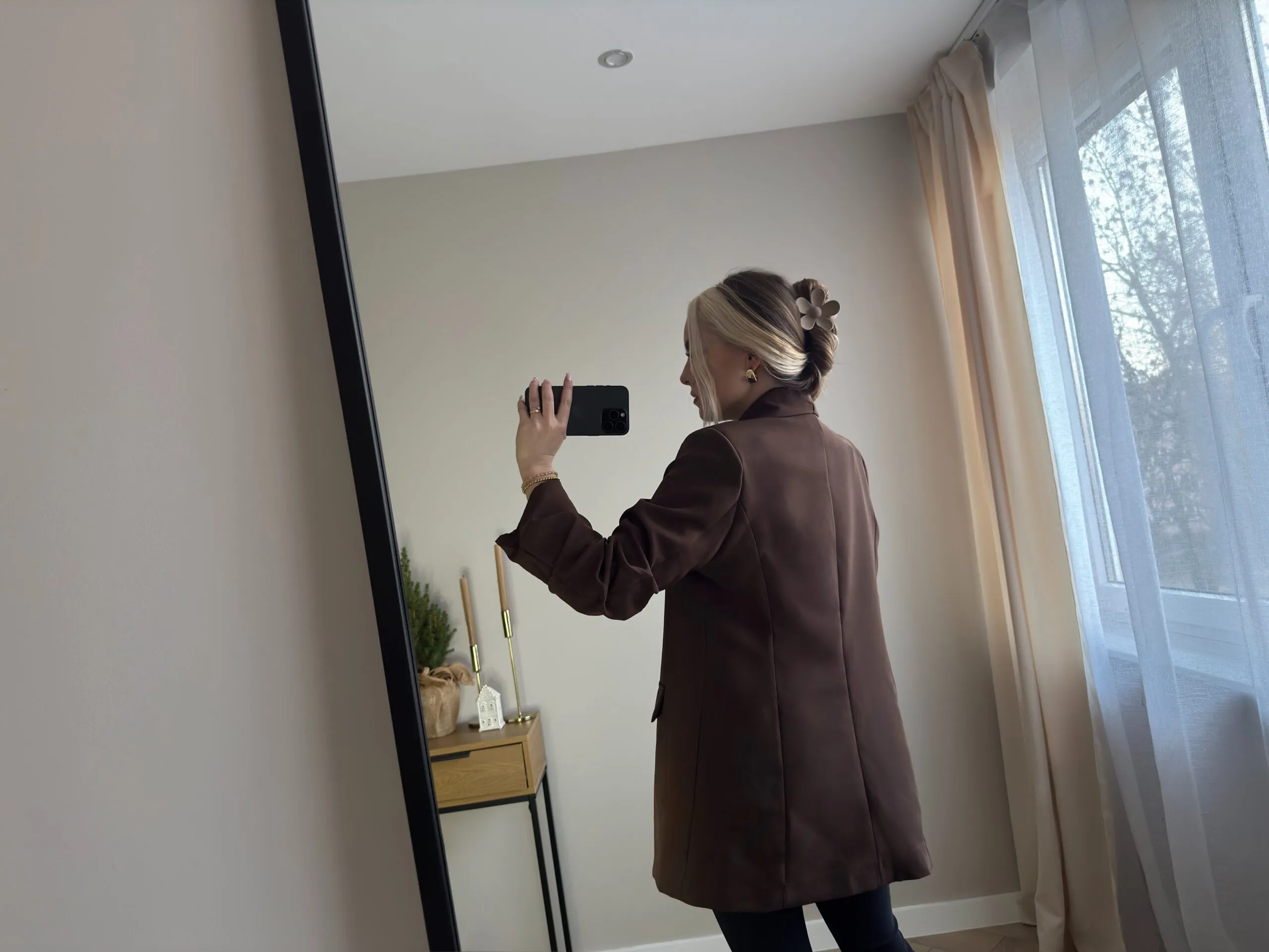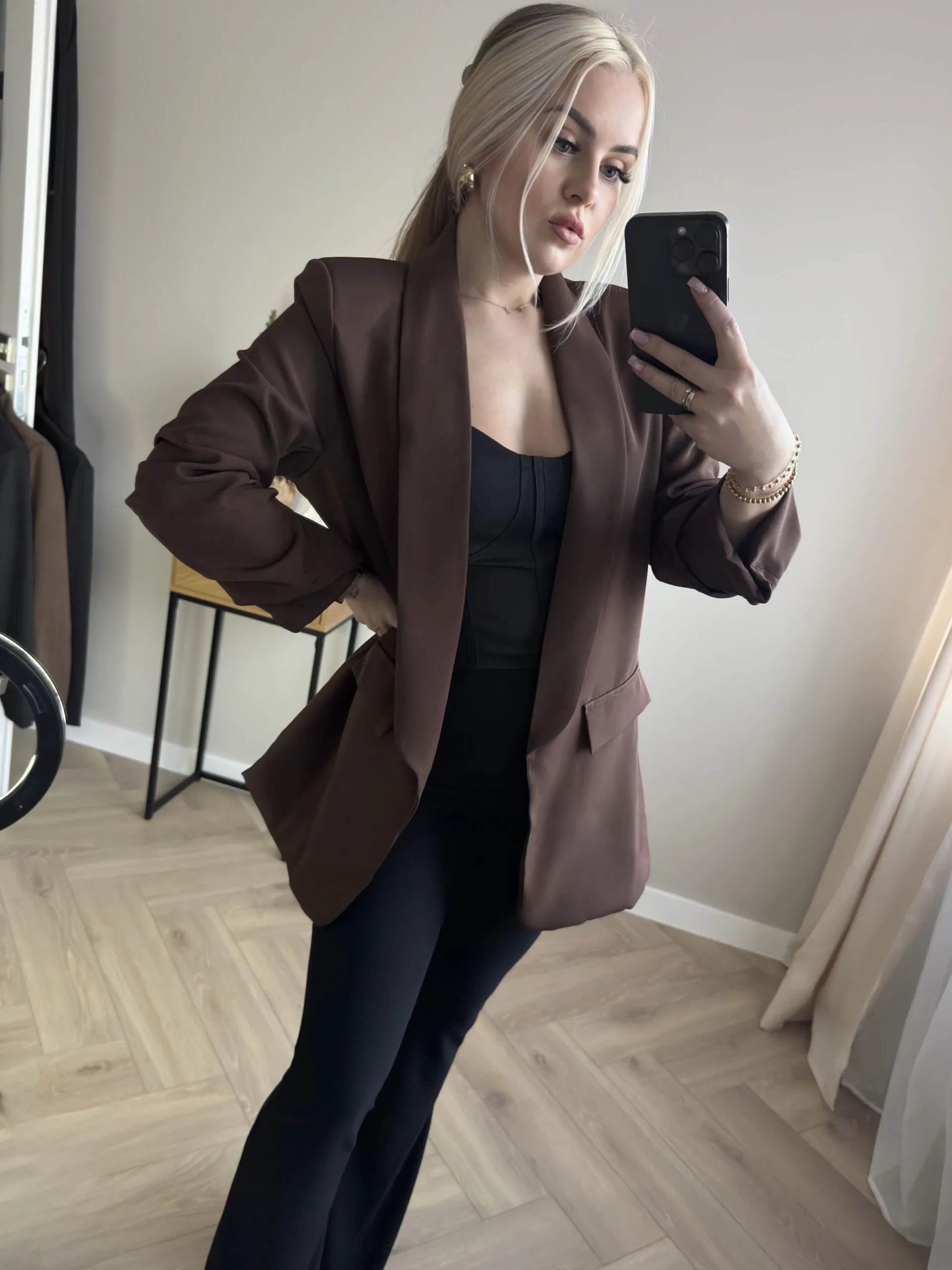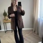Elegancka marynarka w modnym, czekoladowym odcieniu. Model o klasycznym, lekko luźnym kroju, który pięknie układa się na sylwetce i pasuje zarówno do stylizacji biurowych, jak i codziennych.