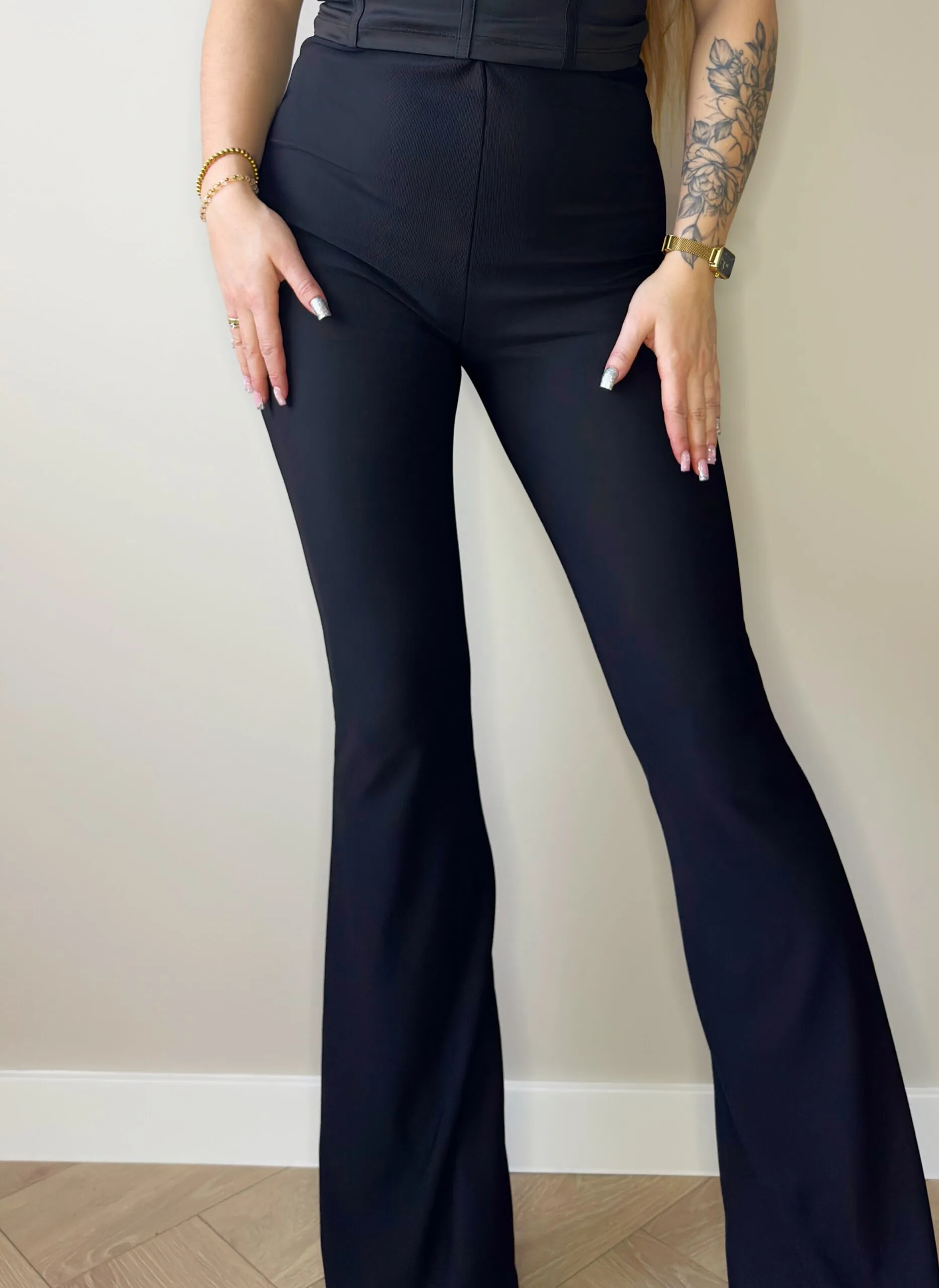 Wysoki stan pięknie podkreśla talię, a lekko rozszerzana nogawka optycznie wydłuża nogi. Elastyczny, prążkowany materiał idealnie dopasowuje się do ciała i daje pełen komfort noszenia.