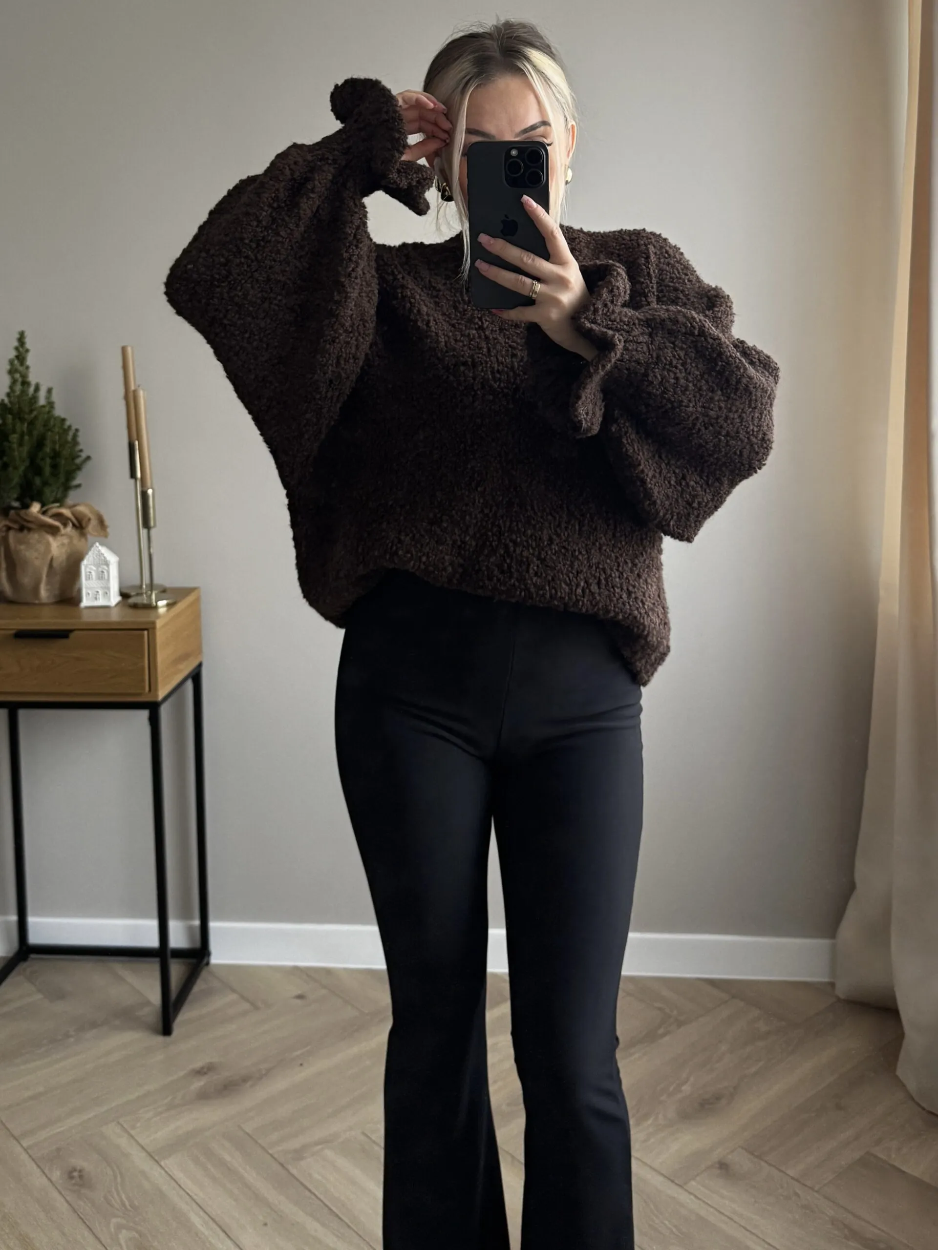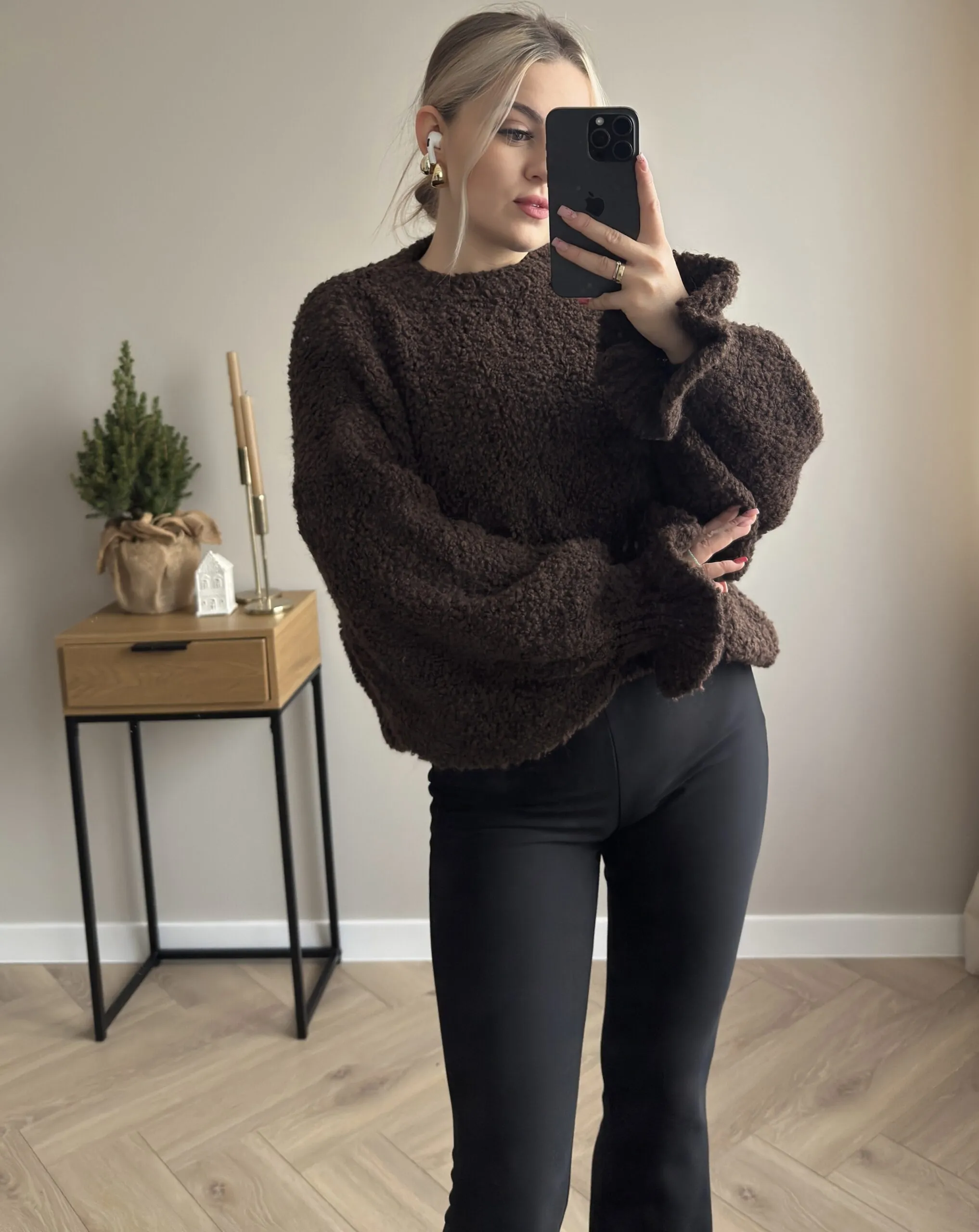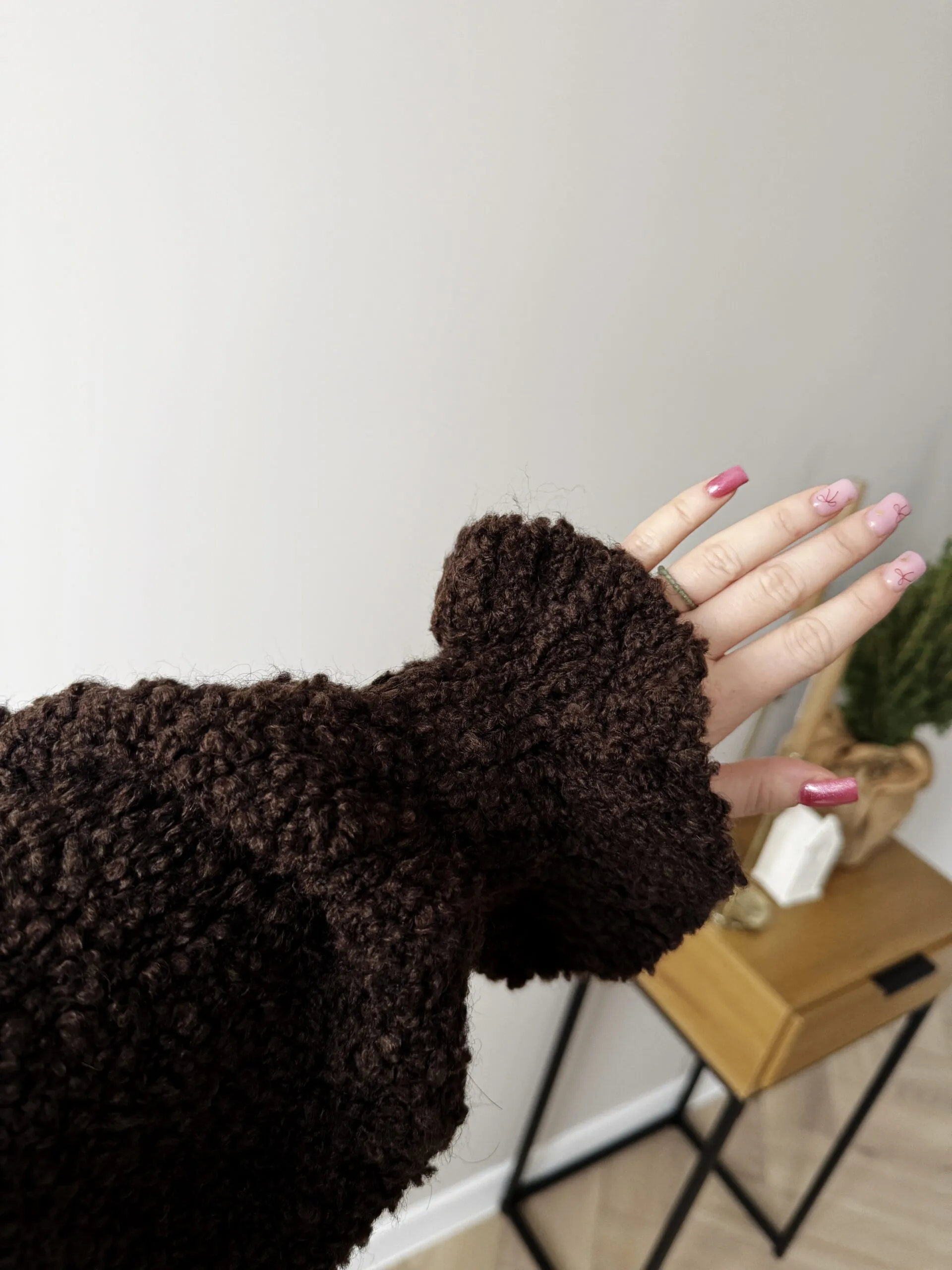 Miękki sweter o buklowej strukturze w głębokim odcieniu czekolady. Luźny fason z szerokimi rękawami pięknie układa się na sylwetce i daje efekt przytulnego, ale stylowego looku.