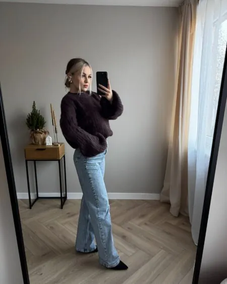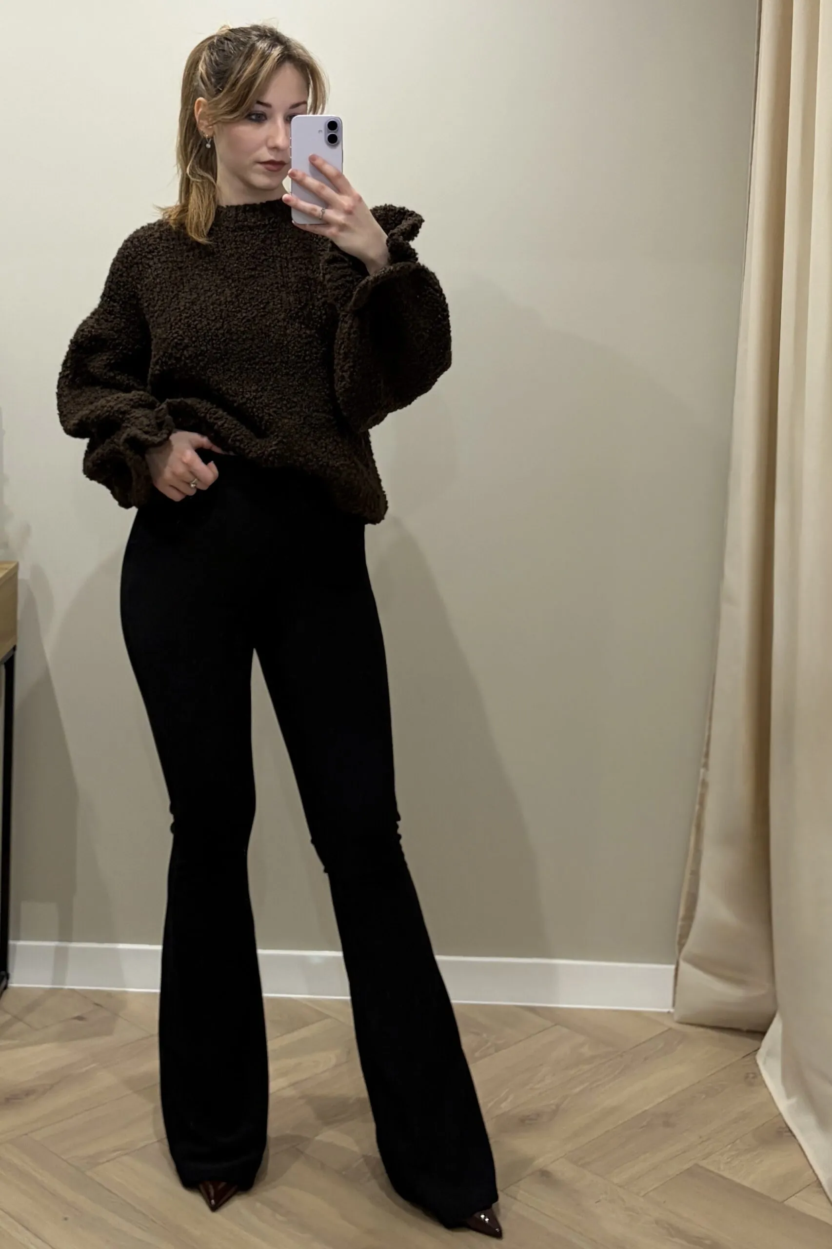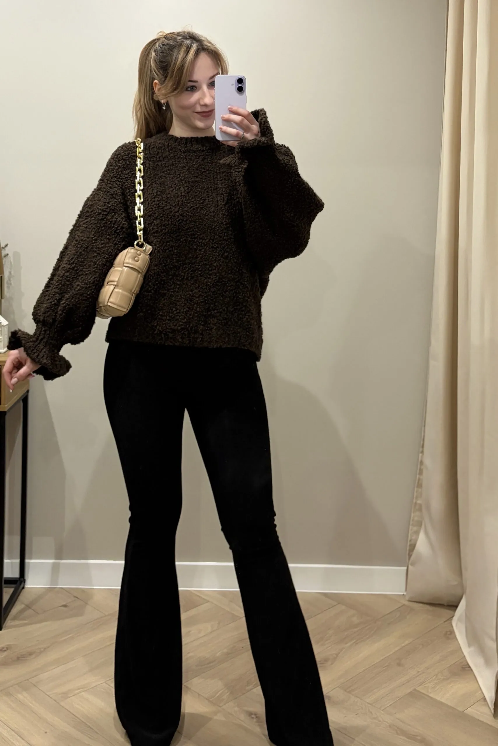 Miękki sweter o buklowej strukturze w głębokim odcieniu czekolady. Luźny fason z szerokimi rękawami pięknie układa się na sylwetce i daje efekt przytulnego, ale stylowego looku.