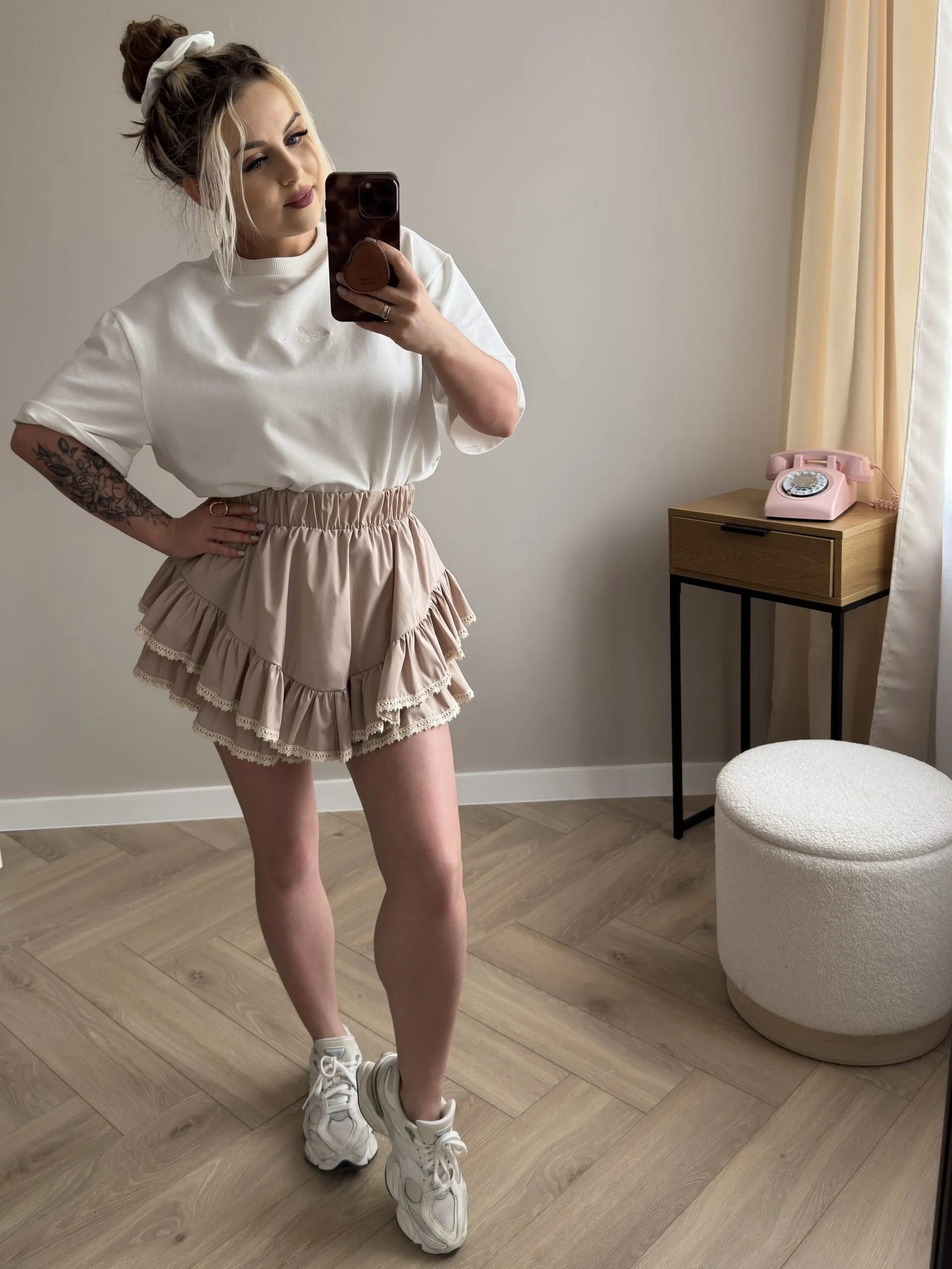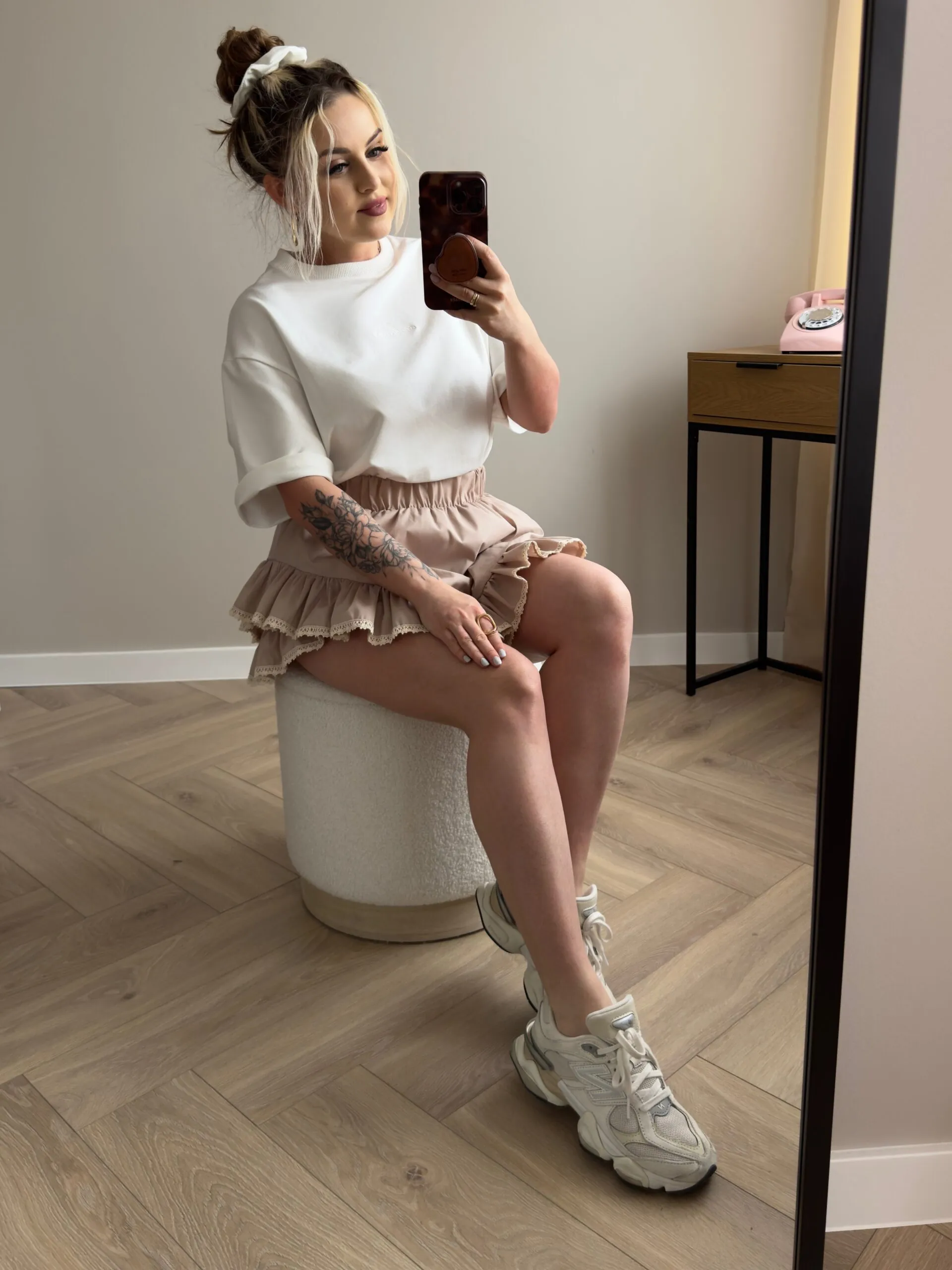 Minimalistyczny T-shirt oversize o luźnym kroju, który łączy wygodę ze stylem. Wykonany z przyjemnego materiału 100 % bawełna. Mały haft z przodu dodaje charakteru. W zestawie znajduję się gumka w kolorze bluzki, wykonana z tego samego materiału. Możesz zawiązać nią bluzkę, użyć do włosów lub zostawić jako dodatek.