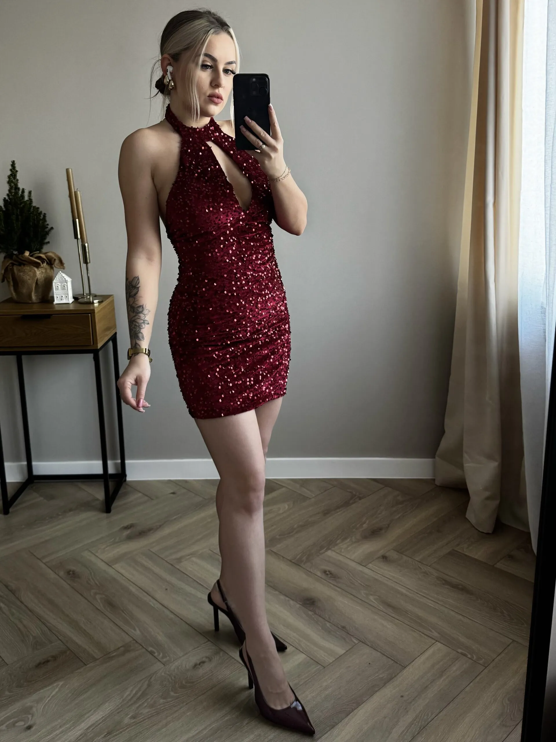 CEKINOWA SUKIENKA Z ODKRYTYMI PLECAMI - BORDO